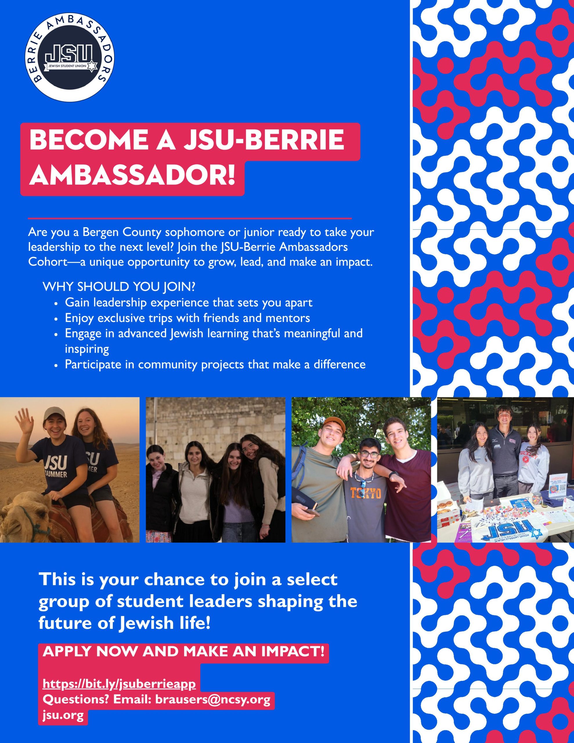 Email Shalom Brauser, the Ambassador Coordinator, at brausers@ncsy.org